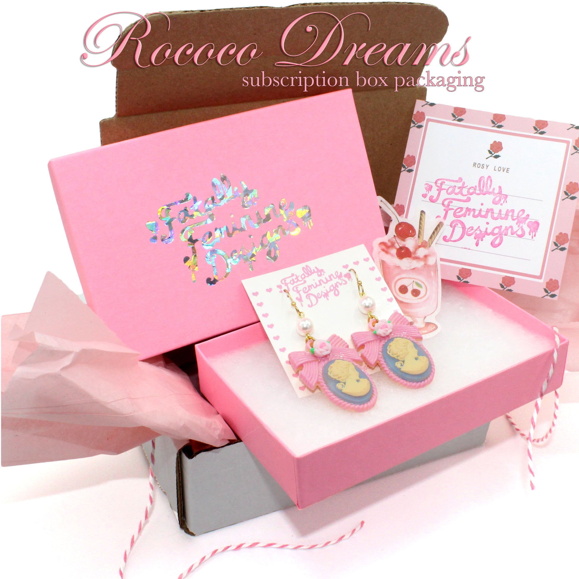 treat yourself every month to expertly hand-crafted jewelry inspired by the rococo aesthetic packaged in perfectly pink gift wrapping for an ultimate unboxing experience that is sure to surprise and delight you each month