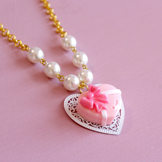 Vintage Pink Heart Chocolate Box Necklace, Valentine's Charm Jewelry, Fatally Feminine Designs