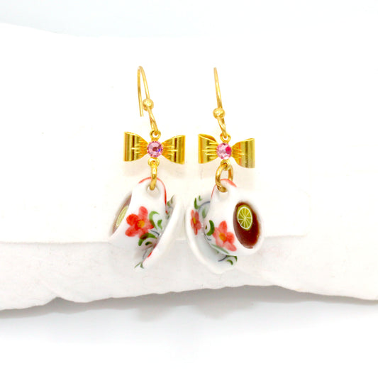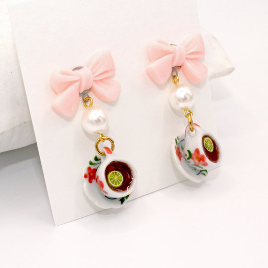 Pink Victorian Tiny Tea Cup Bow & Pearl Earrings, Hypoallergenic Steel - High Tea Collection - Fatally Feminine Designs