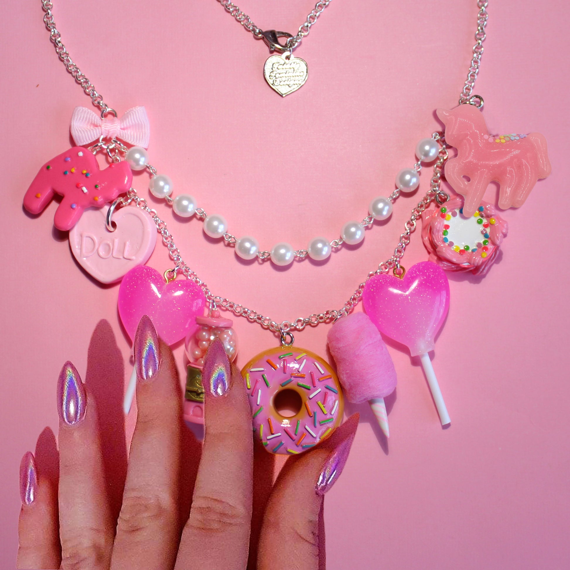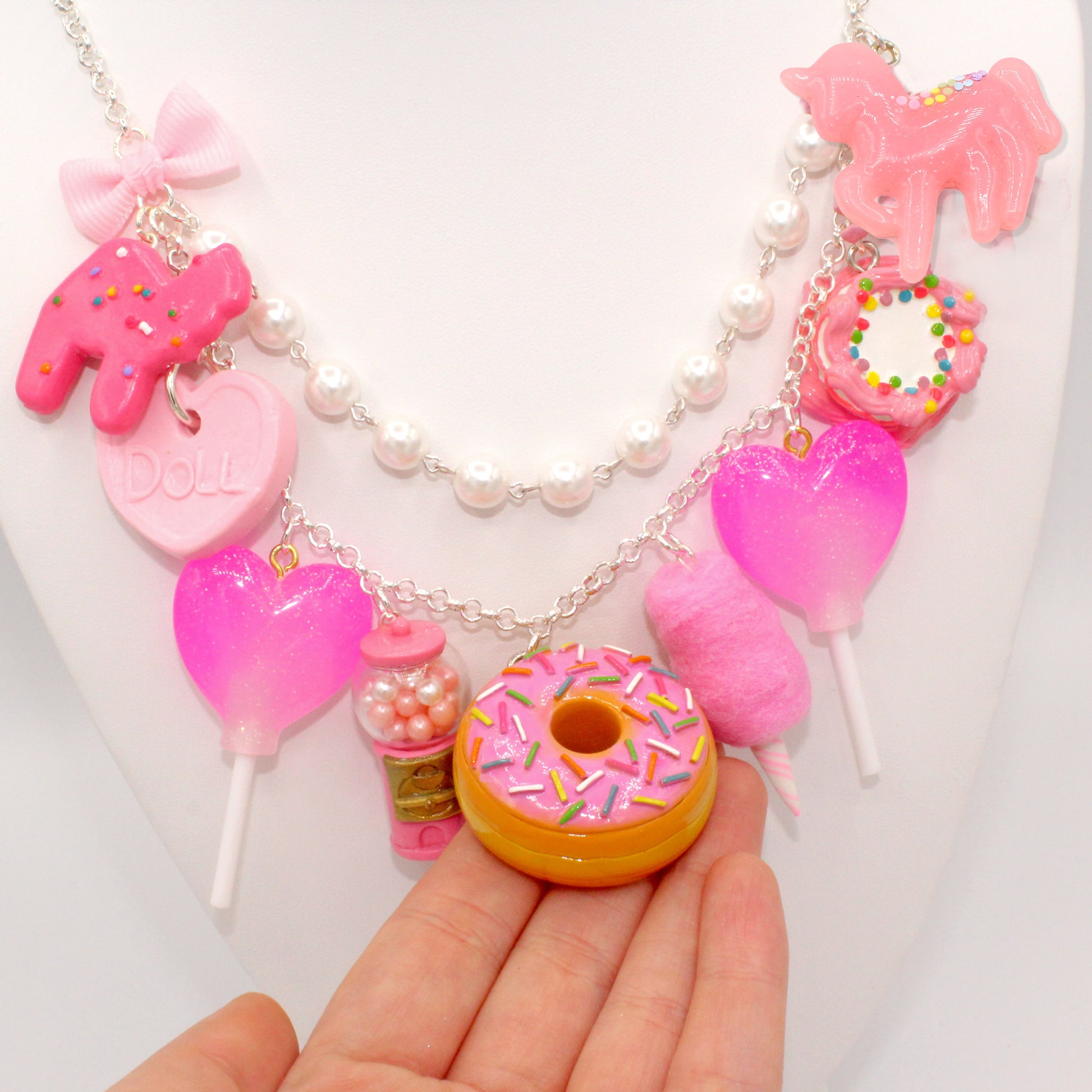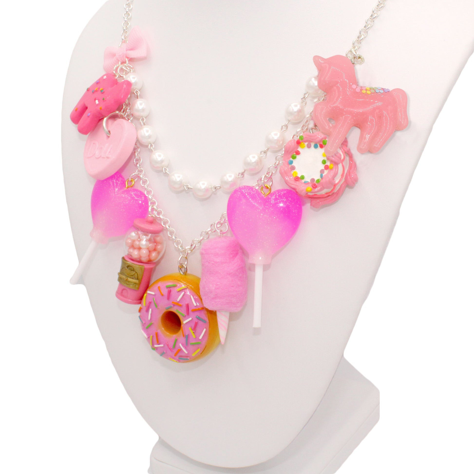 This kawaii statement necklace features tons of fun pink charms inspired by all things cute nostalgic and magical, making this necklace a true statement piece!
