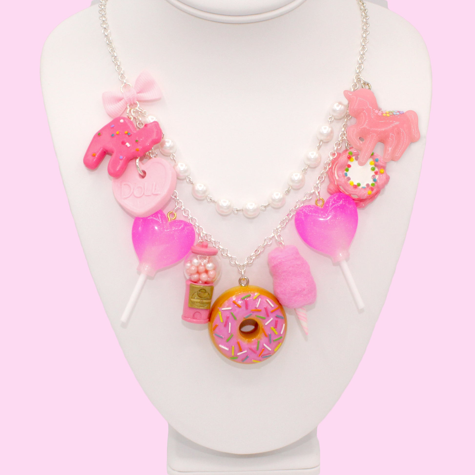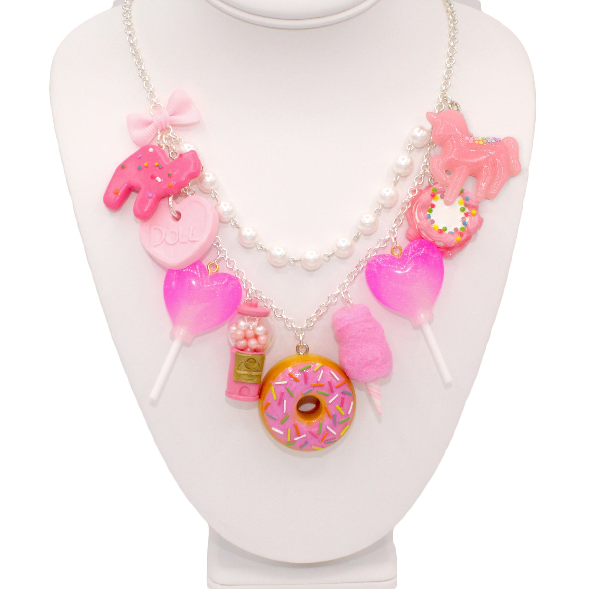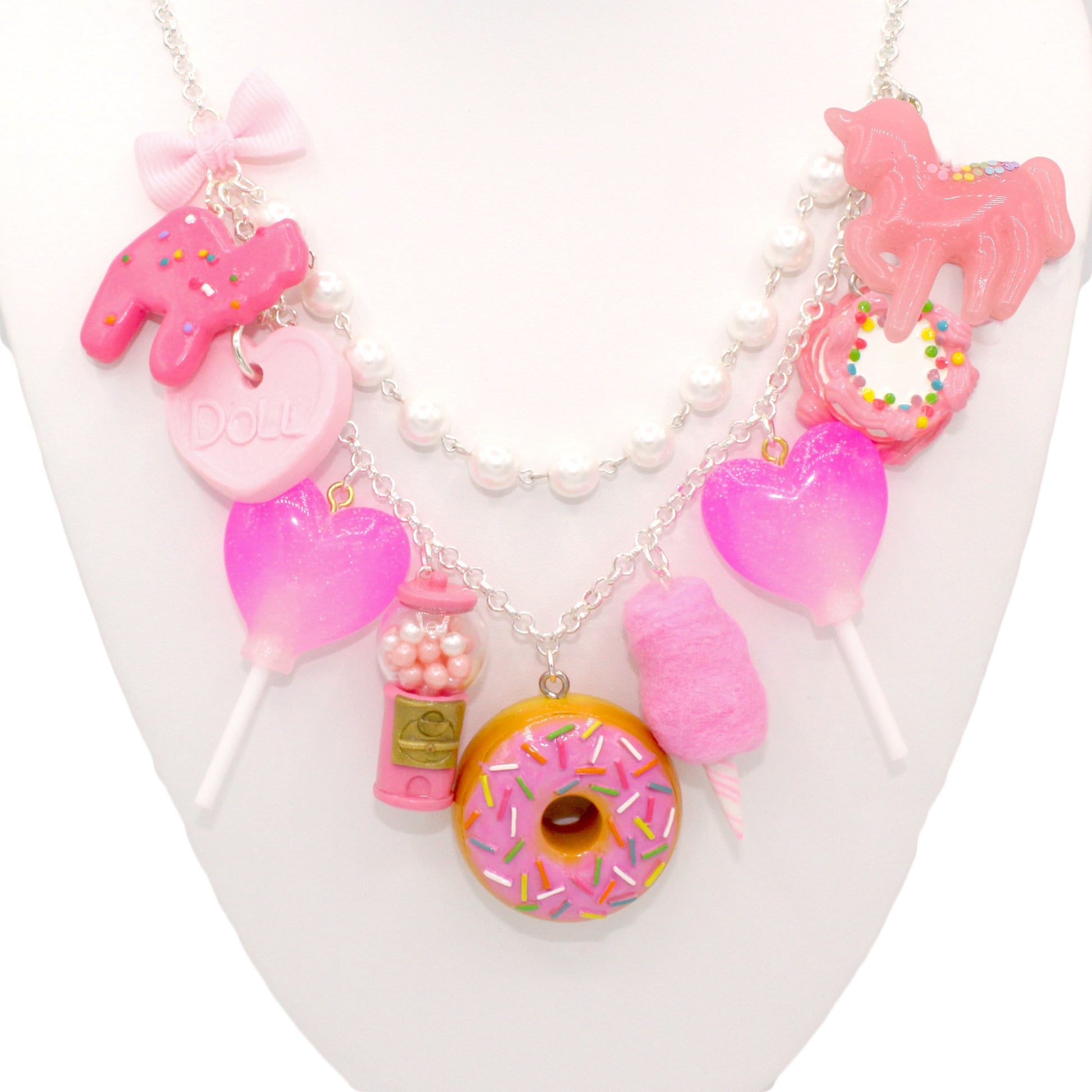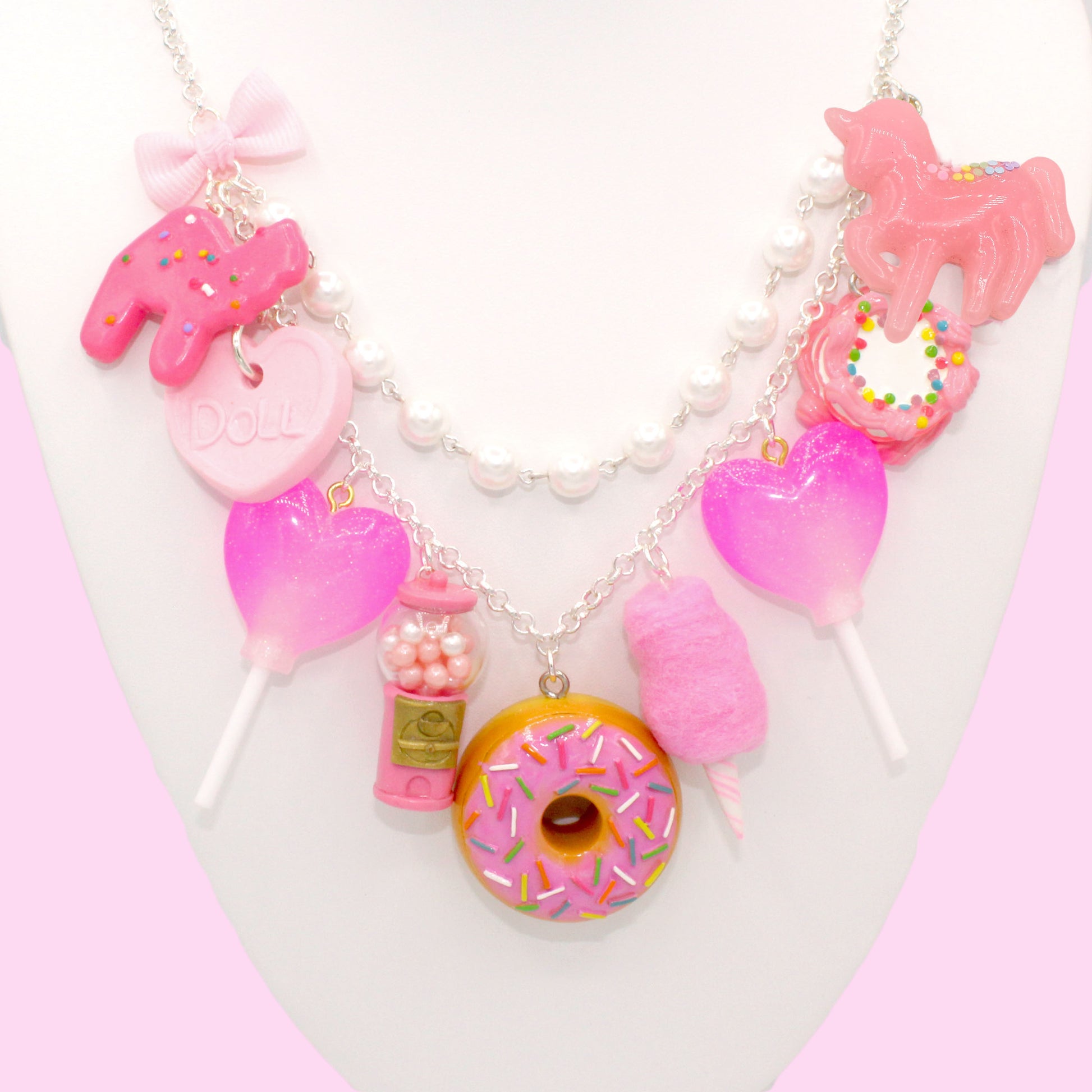 This kawaii statement necklace features tons of fun pink charms inspired by all things cute nostalgic and magical, making this necklace a true statement piece!