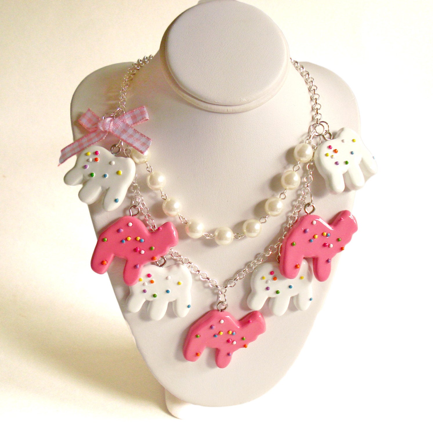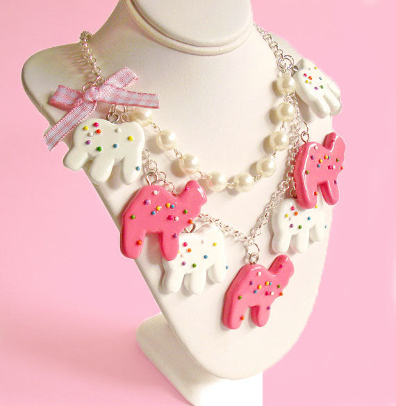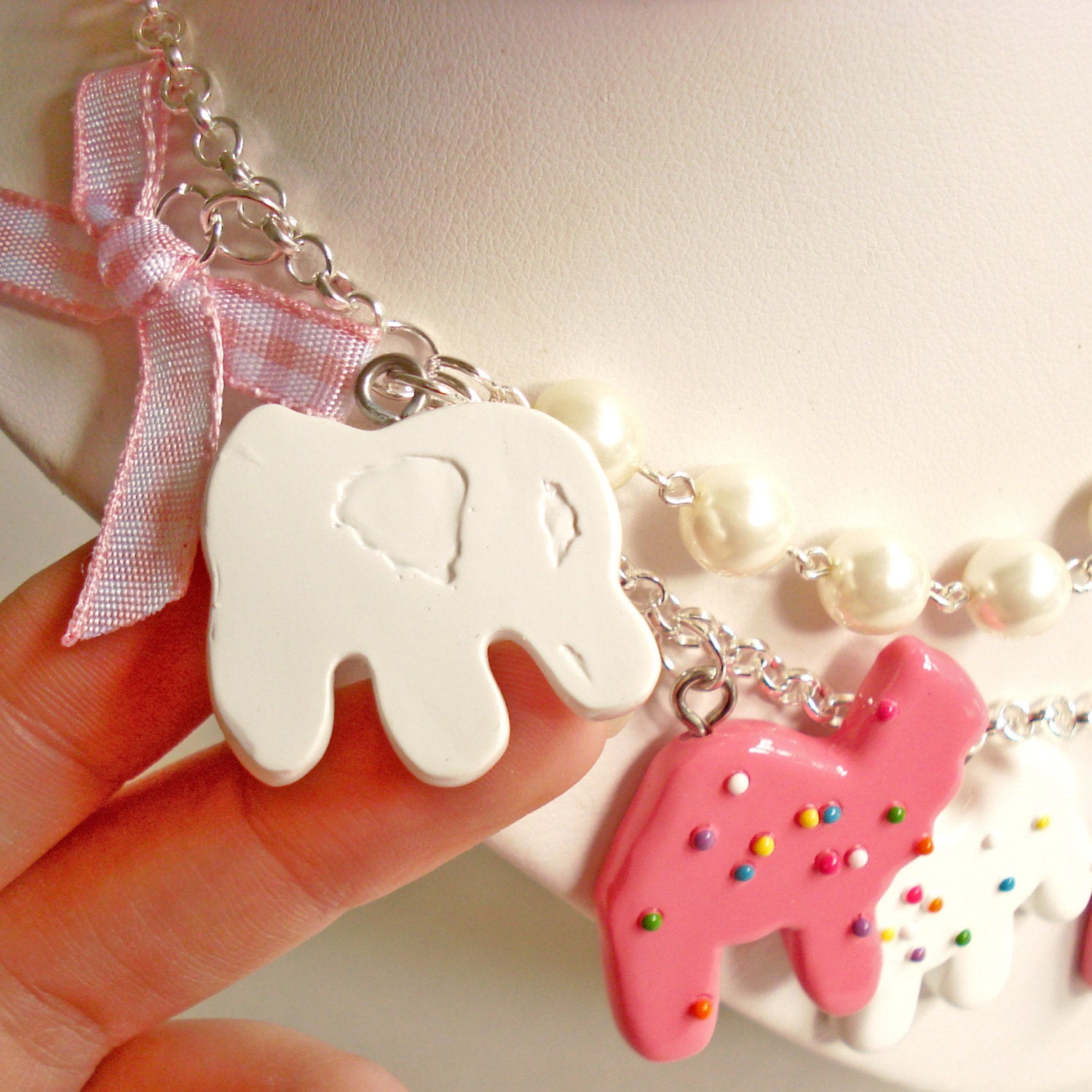 I designed each of these animal cookie charms with great attention to detail in the signature white and pink colors. Each cookie has been frosted and decorated with tiny rainbow sprinkles. This necklace includes cookie charms in the following shapes: Camel and elephant in pink and white alternating, If you order the 5 charm necklace the top two elephant charms will be omitted. Charms hang from high quality silver plated chain below a hand-beaded glass pearl chain. The side is accented with a pink and white bow and the back is finished off with a lobster clasp and and engraved heart charm. Necklace is about 19" in total length. Charms are approx. 1" tall each. This handmade item is fragile, please do not drop on a hard surface which may result in a broken or damaged item.