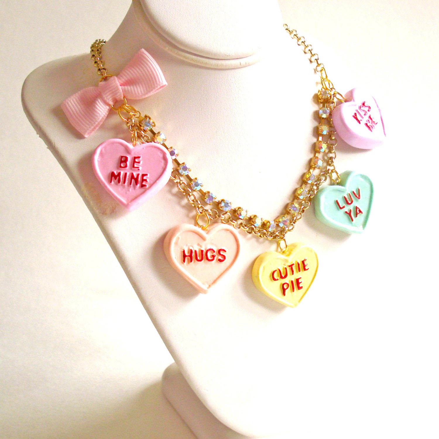 Each conversation heart charm was handmade by me with great attention to detail from polymer clay. These are about 1" long each and are hand painted with classic sweet messages. Colors include all of the favorite pastels: orange, yellow, pink, mint green, and purple. Each necklace includes 5 charms (one of each color and message) that will be glazed for durability and hung with glass pearls on your choice of a 19" gold plated or silver plated chain. Necklace will be finished with a Fatally Feminine Designs engraved heart charm. **do not store in direct sunlight