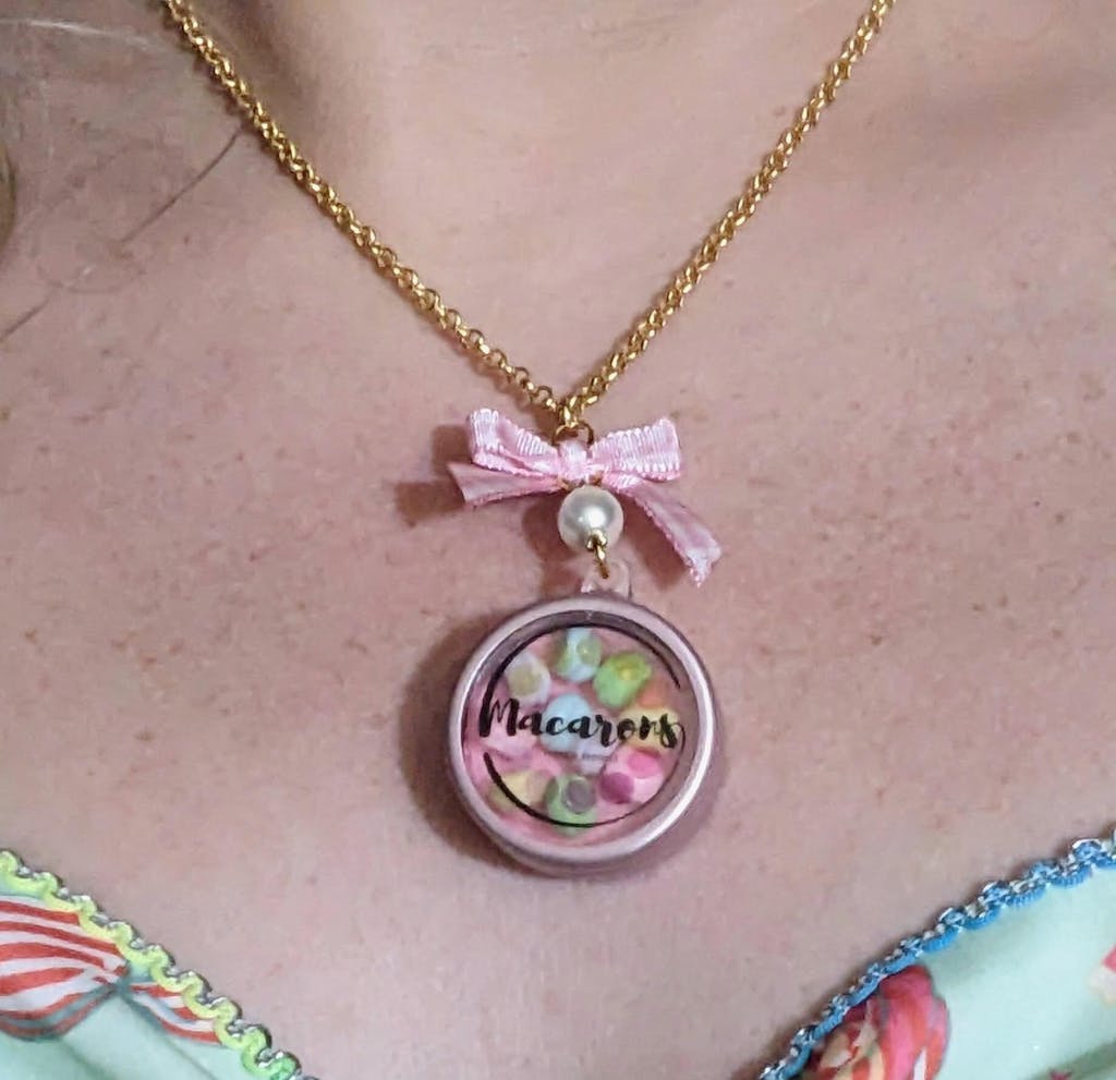 First piece in the rococo box set. It's super cute, a little tin of macarons on a gold chain with a lovely pink checkered bow. I almost immediately had to wear it with a dress I have covered in candy and macarons!